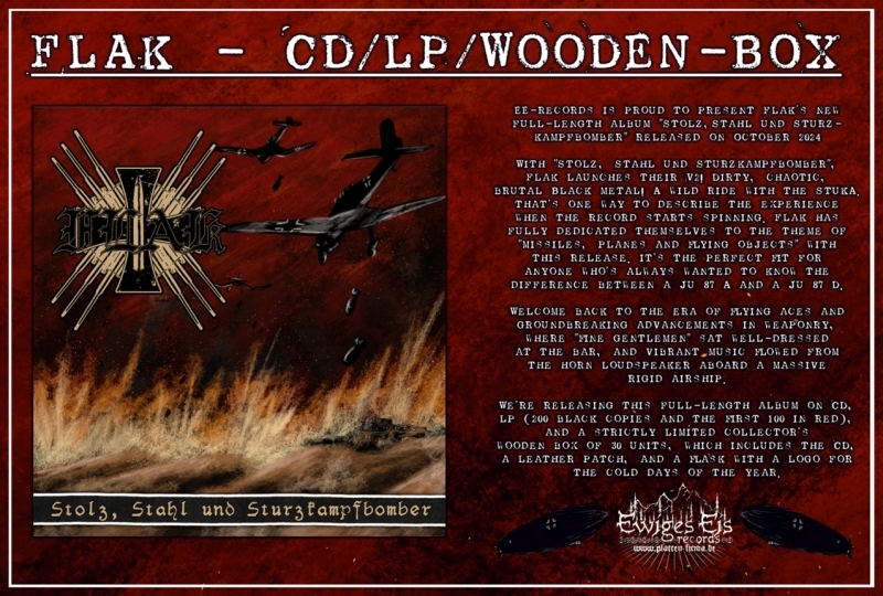 EE-Records is proud to present Flak´s new full-length album "Stolz,Stahl und Sturzkampfbomber" released on October 2024. With "Stolz, Stahl und Sturzkampfbomber", Flak launches their V2! Dirty, chaotic,brutal Black Metal! A wild ride with the STUKA. That’s one way to describe the experience